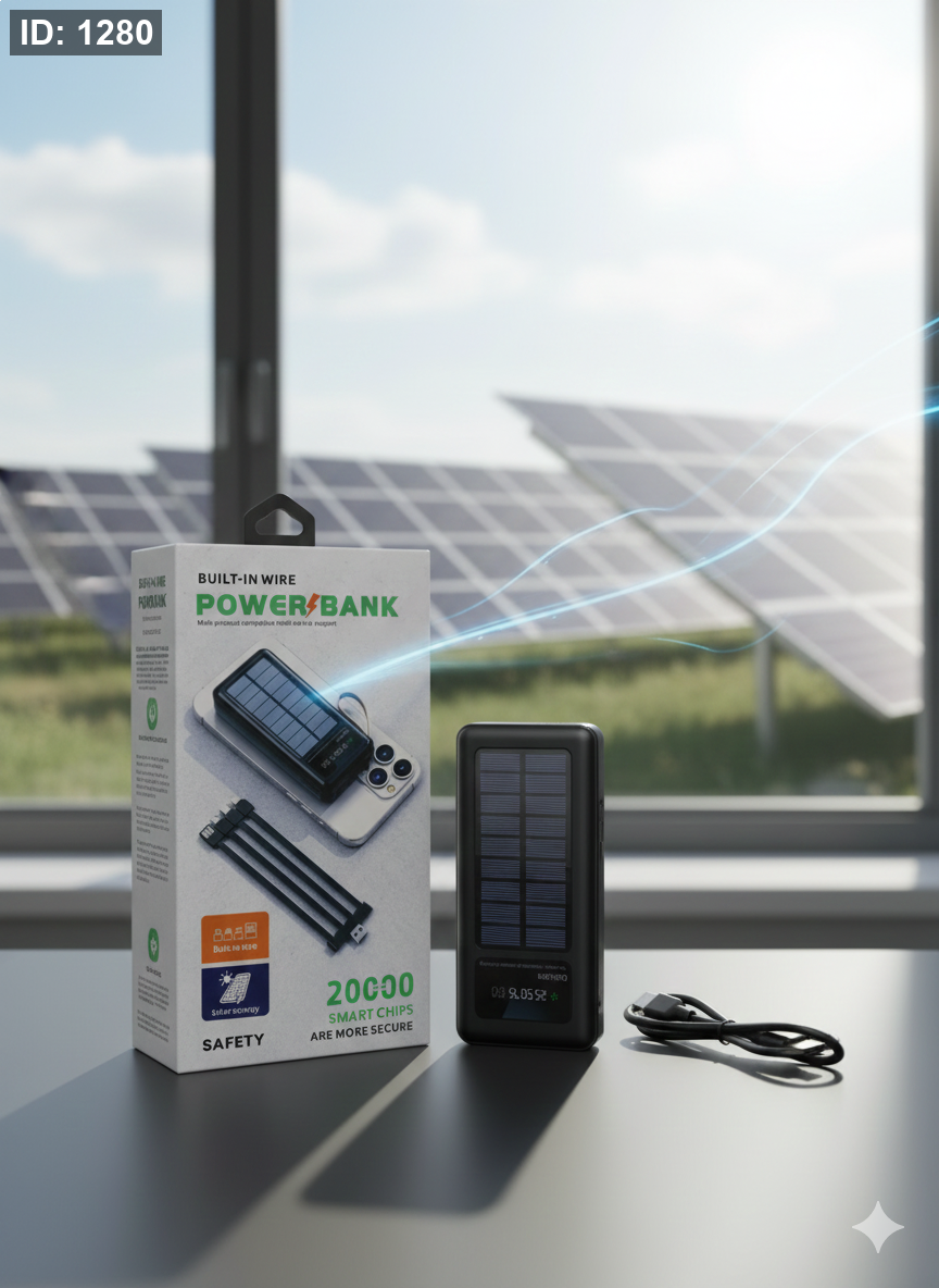 باور بانك شمسي مع أسلاك مدمجة (Built-in Wire Power Bank) باور بانك عملي وذكي يجمع بين الشحن التقليدي والطاقة الشمسية، مع أسلاك مدمجة لتسهيل الاستخدام بدون الحاجة لحمل كابلات إضافية