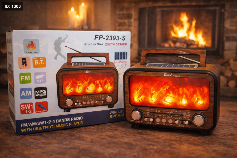 FP-2393-S Wireless Speaker بتصميم خشبي أنيق مع تأثير إضاءة اللهب الواقعي، يدعم Bluetooth وتشغيل الموسيقى عبر USB وTF، مع استقبال FM / AM / SW وبطارية قابلة للشحن ولوح شمسي. قطعة تجمع بين الصوت والديكور، مثالية للبيت، الرحلات، والأجواء الدافئة.