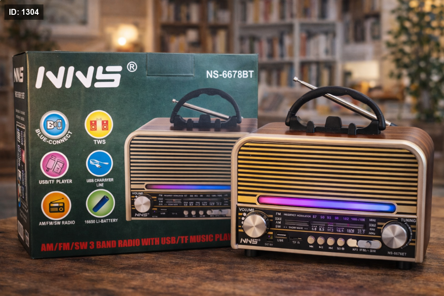 راديو NNS NS-6678BT بتصميم ريترو أنيق مع إضاءة LED جذابة، يدعم Bluetooth وTWS وتشغيل الموسيقى عبر USB وTF، مع استقبال AM / FM / SW وبطارية 18650 قابلة للشحن. عملي وسهل الحمل، مثالي للبيت أو الرحلات.