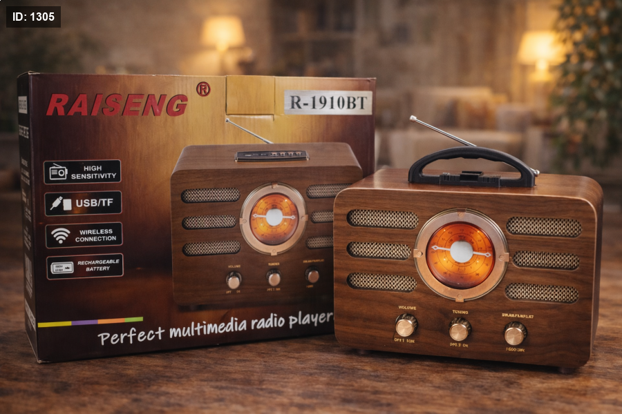 راديو RAISENG R-1910BT بتصميم ريترو خشبي فاخر مع قرص تناظري مضيء، يدعم Bluetooth وتشغيل الموسيقى عبر USB وTF، مع بطارية قابلة للشحن وصوت عالي الجودة. قطعة أنيقة تجمع بين الأصالة والتقنية الحديثة