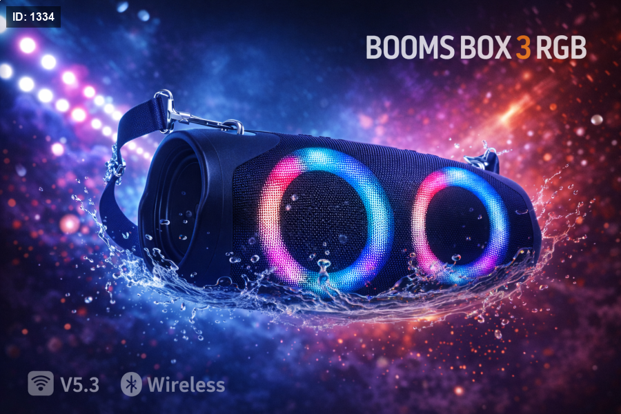 سماعة Booms Box 3 RGB بقوة صوت عالية وواضحة، مزودة بإضاءة RGB جذابة تعطيك أجواء حفلات أين ما كنت. تصميم قوي ومقاوم، اتصال بلوتوث سريع، وبطارية تدوم لساعات طويلة — الخيار المثالي للرحلات، السهرات، والاستخدام اليومي