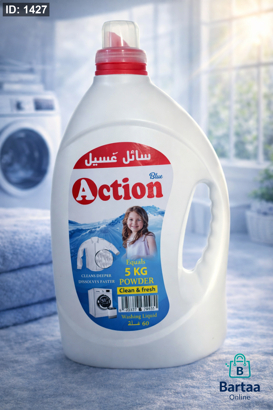 سائل غسيل Action Blue بتركيبة قوية وفعّالة تزيل الأوساخ بعمق وتذوب بسرعة داخل الغسالة، لتمنح الملابس نظافة واضحة وانتعاشًا يدوم مع كل غسلة، مع الحفاظ على نعومة وجودة الأقمشة