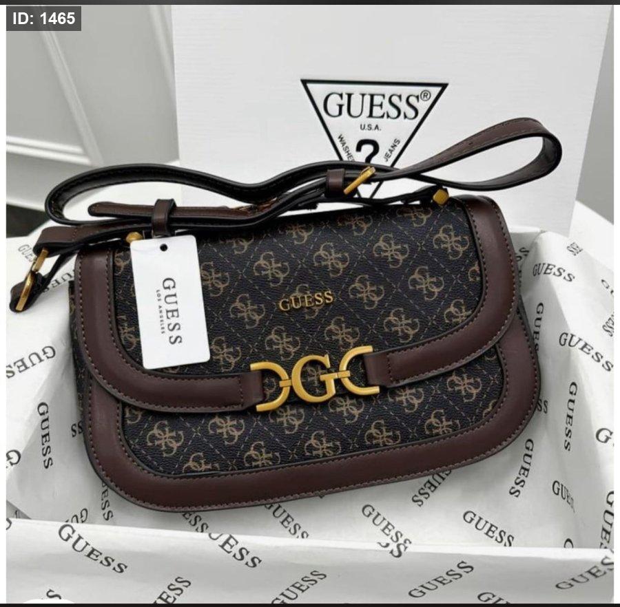 حقيبة نسائية أنيقة بتصميم فاخر ونقشة مميزة من GUESS، مع تفاصيل جلدية وإغلاق ذهبي أنيق يبرز فخامتها. عملية وعصرية، مثالية للاستخدام اليومي والمناسبات لإطلالة راقية وجذابة.