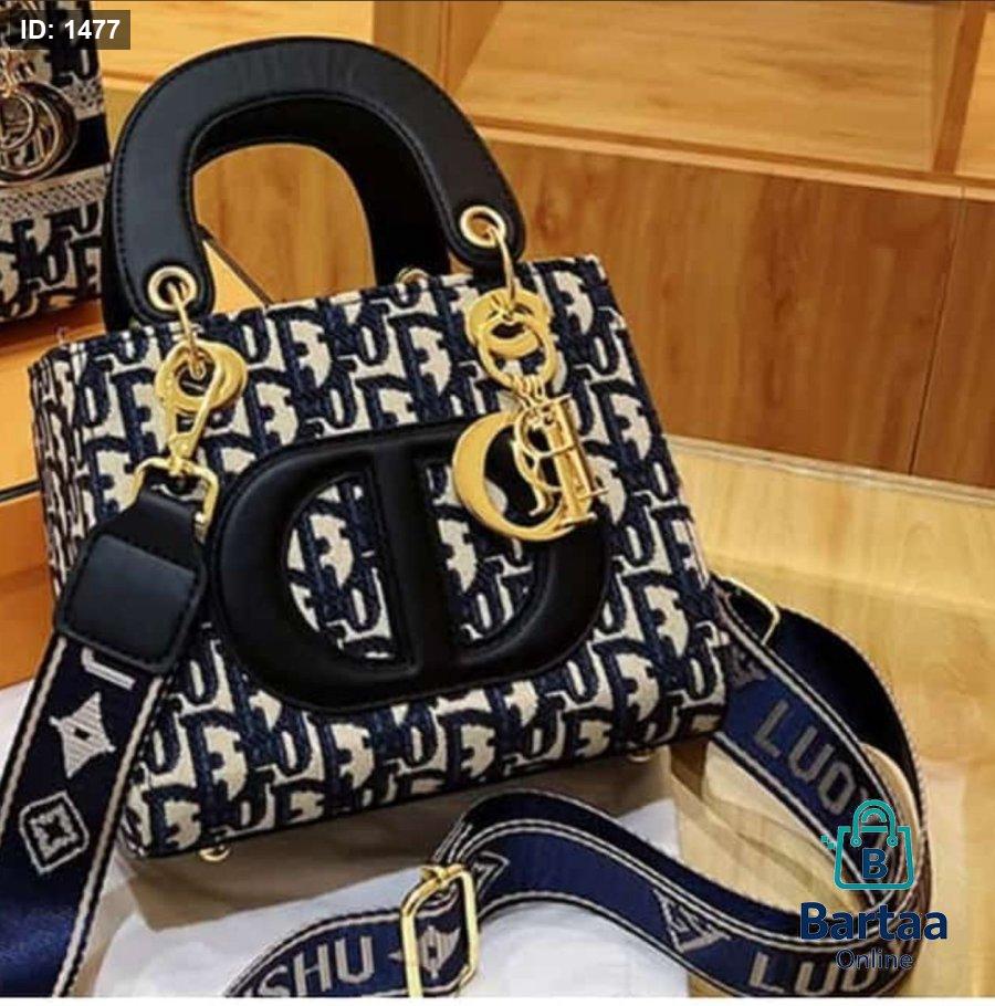 حقيبة نسائية فاخرة بتصميم أيقوني من Dior، بنقشة مميزة وشعار بارز مع تفاصيل ذهبية أنيقة. مزودة بمقبض علوي وحزام كتف عريض، مثالية للإطلالات اليومية والمناسبات بلمسة فخامة لافتة.