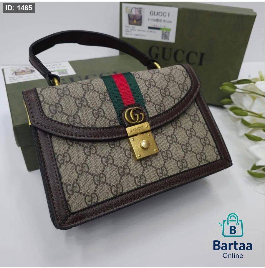 حقيبة نسائية فاخرة من Gucci بتصميم كلاسيكي أنيق، مزينة بنقشة GG الشهيرة وشريط الألوان المميز مع قفل ذهبي راقٍ. مثالية لإطلالة فخمة تجمع بين الأناقة والعملية في كل مناسبة.