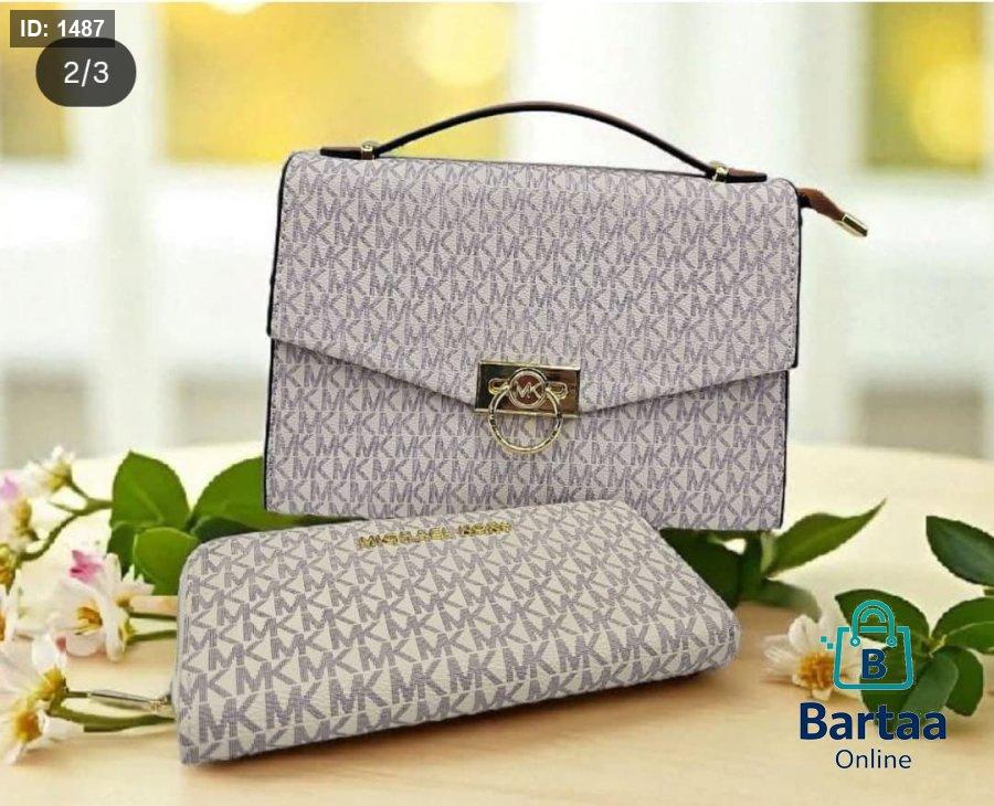 طقم أنيق من Michael Kors بتصميم راقٍ ونقشة MK الكلاسيكية، يضم حقيبة يد فخمة مع محفظة متناسقة. اختيار مثالي لإطلالة أنثوية عصرية تجمع بين الأناقة والعملية في كل وقت.