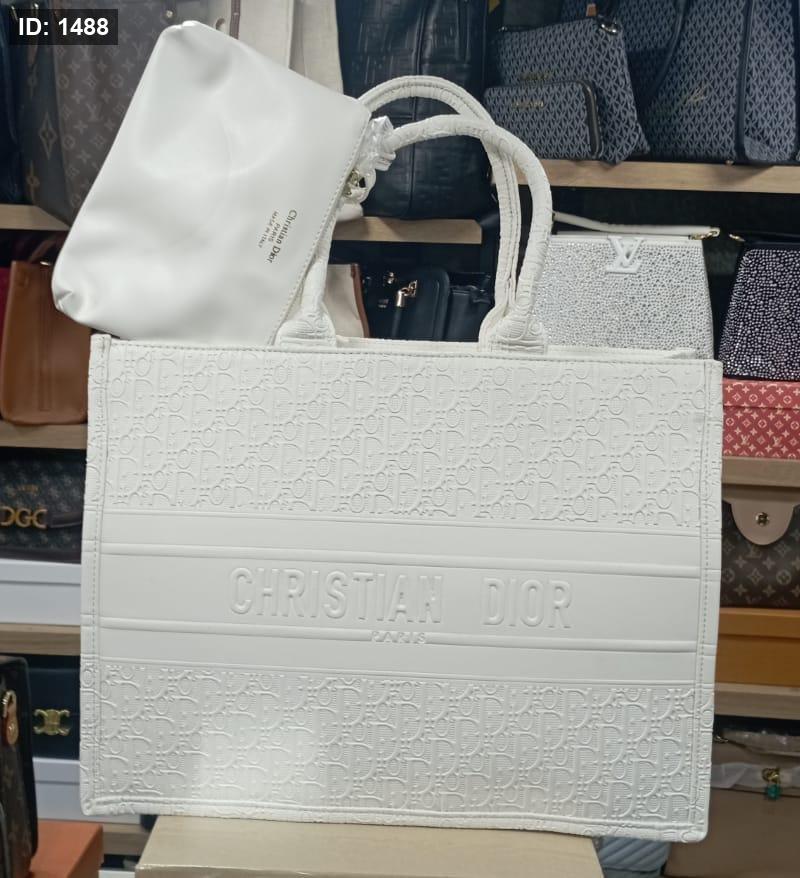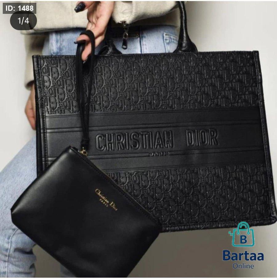 حقيبة فاخرة من Christian Dior بتصميم أسود أنيق ونقشة Dior الكلاسيكية البارزة، مع محفظة مرافقة عملية. اختيار مثالي لإطلالة راقية تجمع بين القوة، الفخامة، والعملية في آنٍ واحد.