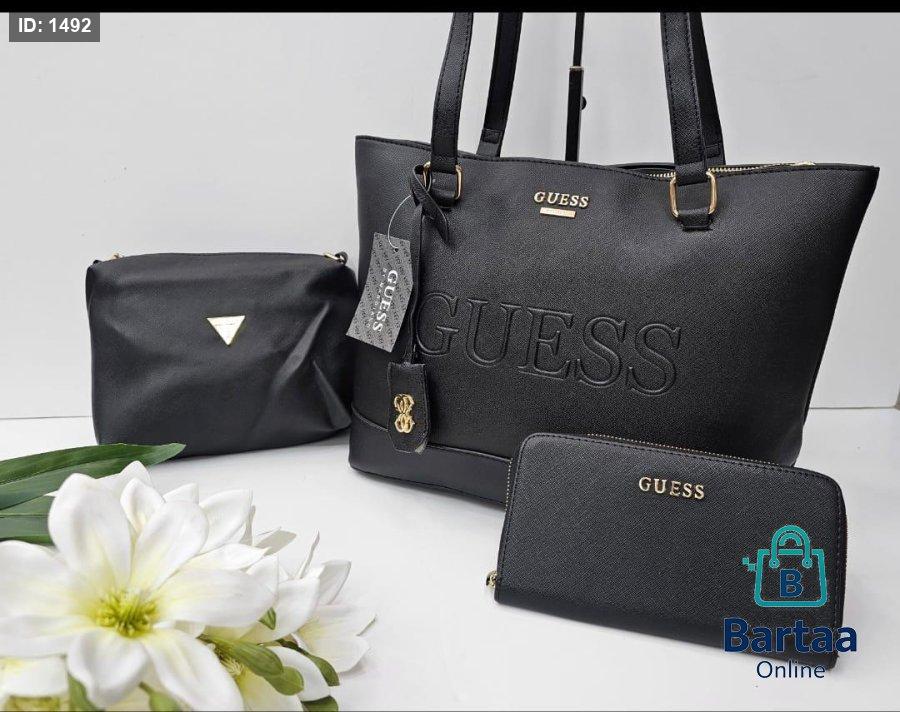طقم أنيق من GUESS باللون الأسود الكلاسيكي، يضم حقيبة يد واسعة مع محفظة وشنطة صغيرة متناسقة. تصميم راقٍ يجمع بين العملية والفخامة، مثالي للاستخدام اليومي ولإطلالة أنثوية عصرية بثقة وأناقة.