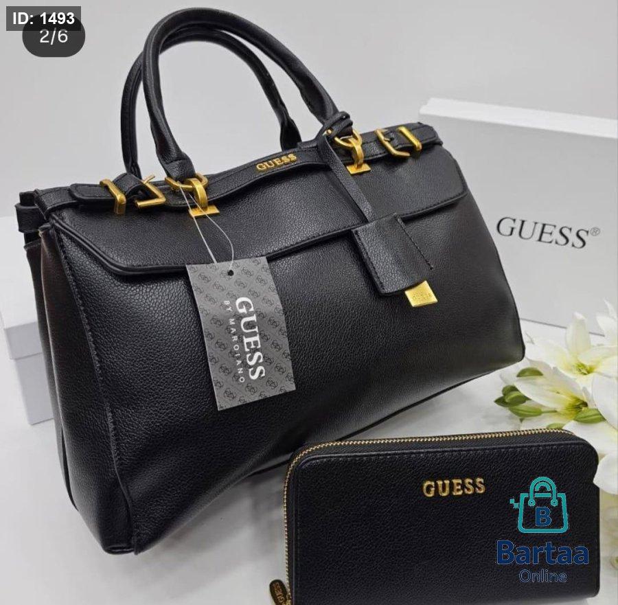 حقيبة يد فاخرة من GUESS باللون الأسود الكلاسيكي مع محفظة متناسقة، بتفاصيل معدنية ذهبية تضيف لمسة راقية. تصميم عملي وأنيق يناسب العمل والمناسبات اليومية بإطلالة أنثوية واثقة.