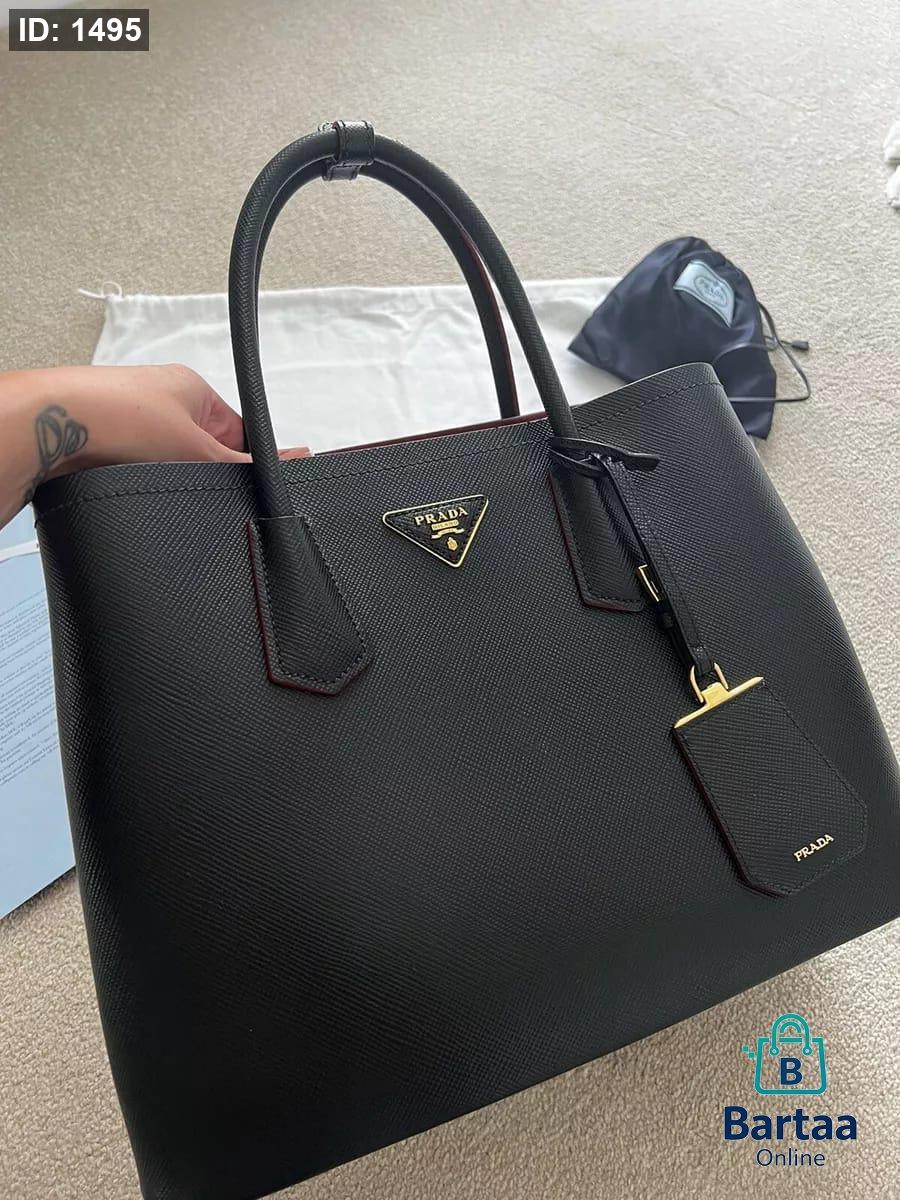 حقيبة يد فاخرة من Prada بتصميم أسود كلاسيكي وخامة أنيقة متينة، تجمع بين البساطة الراقية والعملية اليومية. خيار مثالي لإطلالة أنثوية فخمة تعكس ذوقًا عصريًا وثقة عالية.