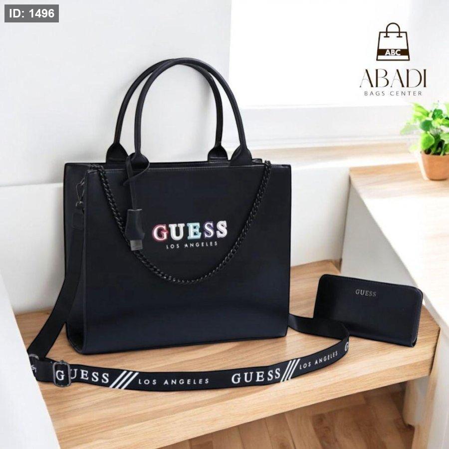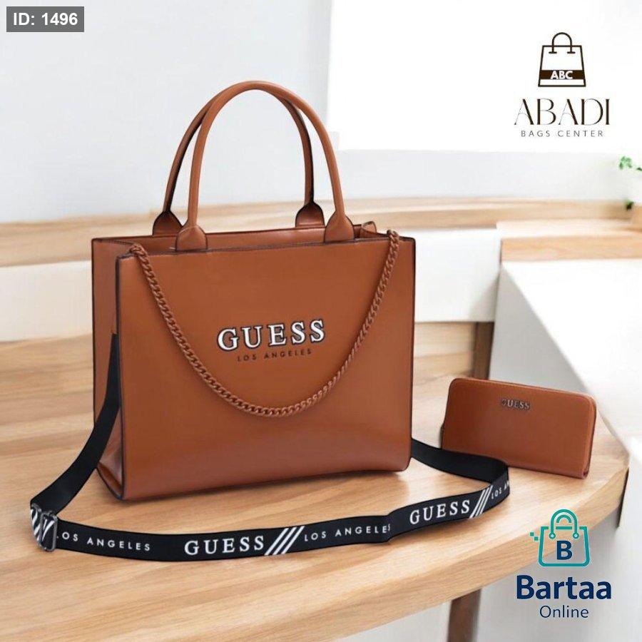 حقيبة أنيقة من GUESS بلون بني دافئ ولمسة سلسلة عصرية، مع حزام كتف عملي ومحفظة متناسقة. تصميم يجمع بين الفخامة والبساطة، مثالي لإطلالة يومية راقية ولمناسباتك بكل أناقة.