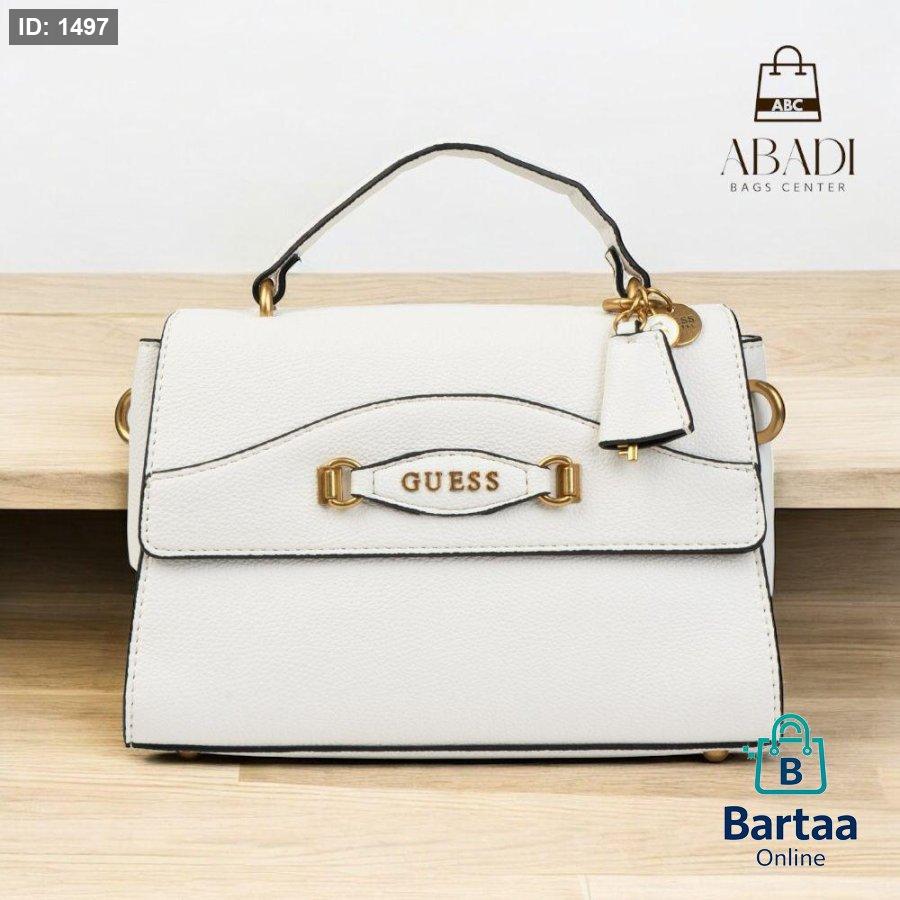 حقيبة يد أنيقة من GUESS باللون الأبيض الراقي مع تفاصيل ذهبية فاخرة. تصميم ناعم وعصري يضيف لمسة فخامة لإطلالتك اليومية والمناسبات الخاصة، مع حجم عملي وأناقة لا تُقاوَم.