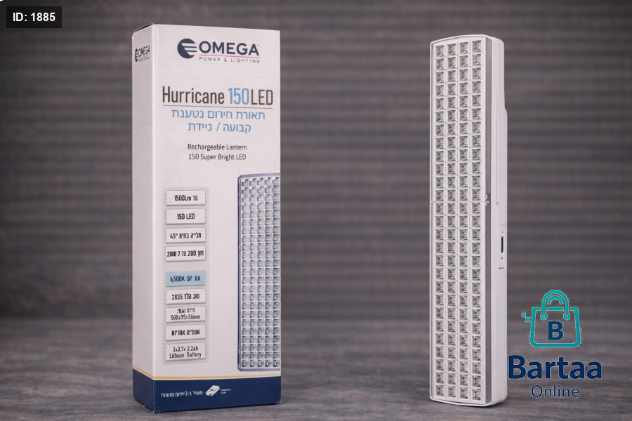 كشاف طوارئ قابل للشحن Hurricane 150 LED – OMEGA إضاءة قوية تصل حتى 1500 لومن مع 150 LED بلون ضوء نهاري 6500K. بطارية ليثيوم قوية تعمل حتى 24 ساعة، زاوية إضاءة 45°، ومناسب للطوارئ، المنزل، والرحلات