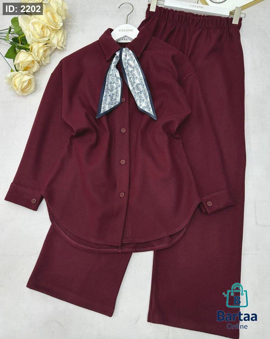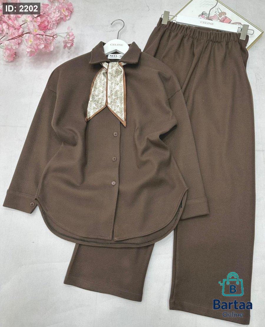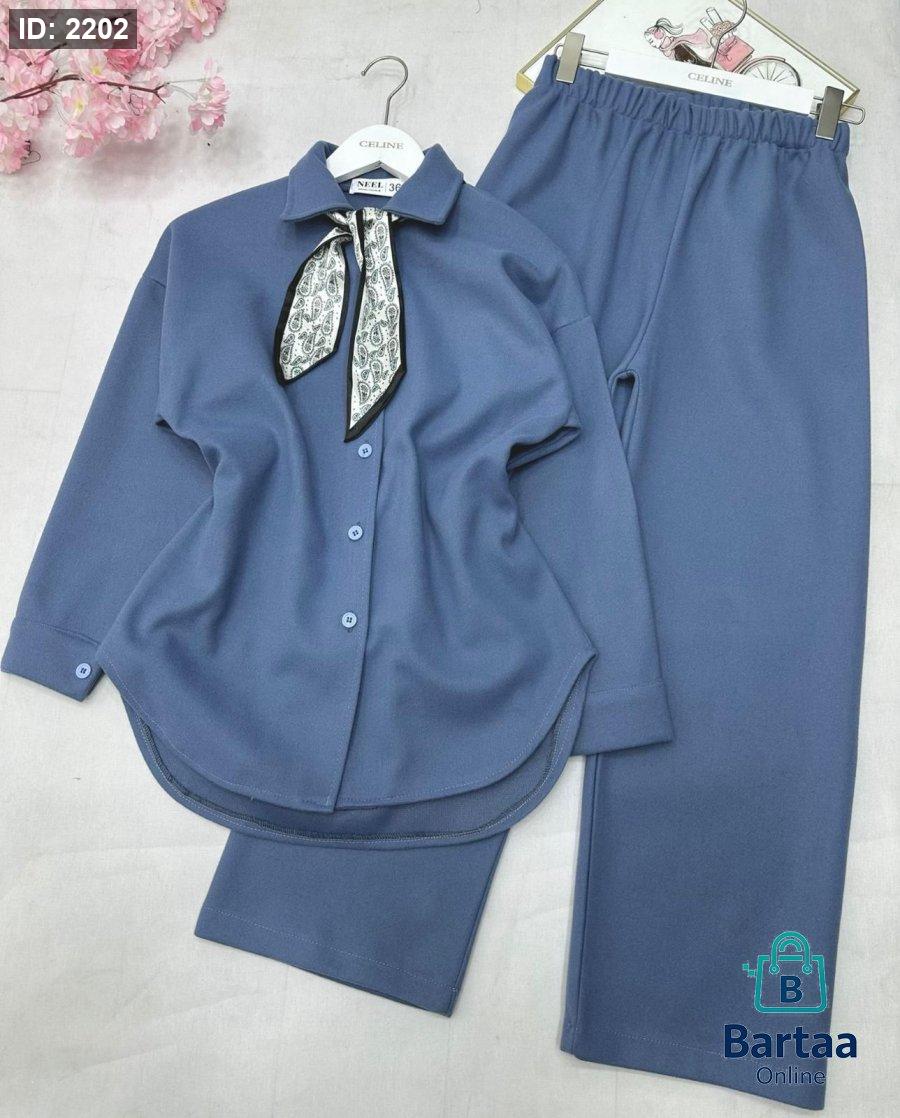 طقم بناتي أنيق 💙 قميص بتصميم عصري مع ربطة رقبة مميزة وبنطال مريح بخصر مطاطي، إطلالة راقية ومثالية للمناسبات والخروج اليومي ✨