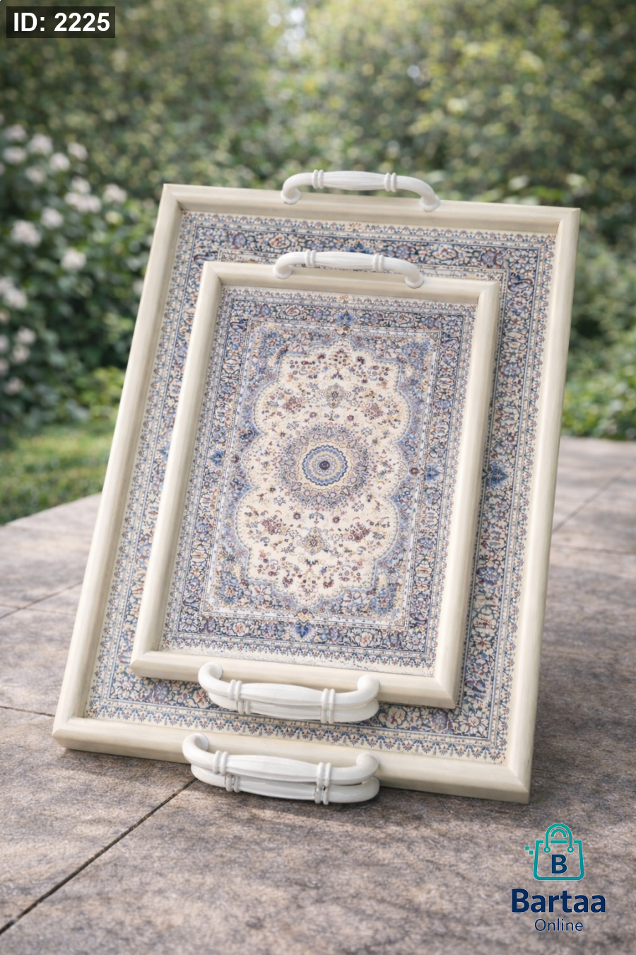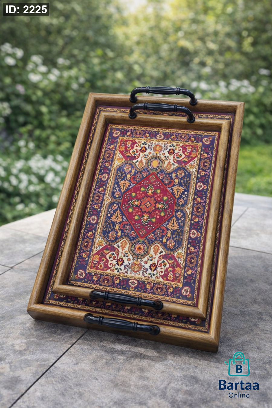 طقم صواني تقديم أنيق (كبير + صغير) 🫖 بتصميم شرقي فاخر ونقوش جميلة، مع مقابض مريحة للحمل. مثالي للتقديم والضيافة ويضيف لمسة فخامة لأي طاولة.