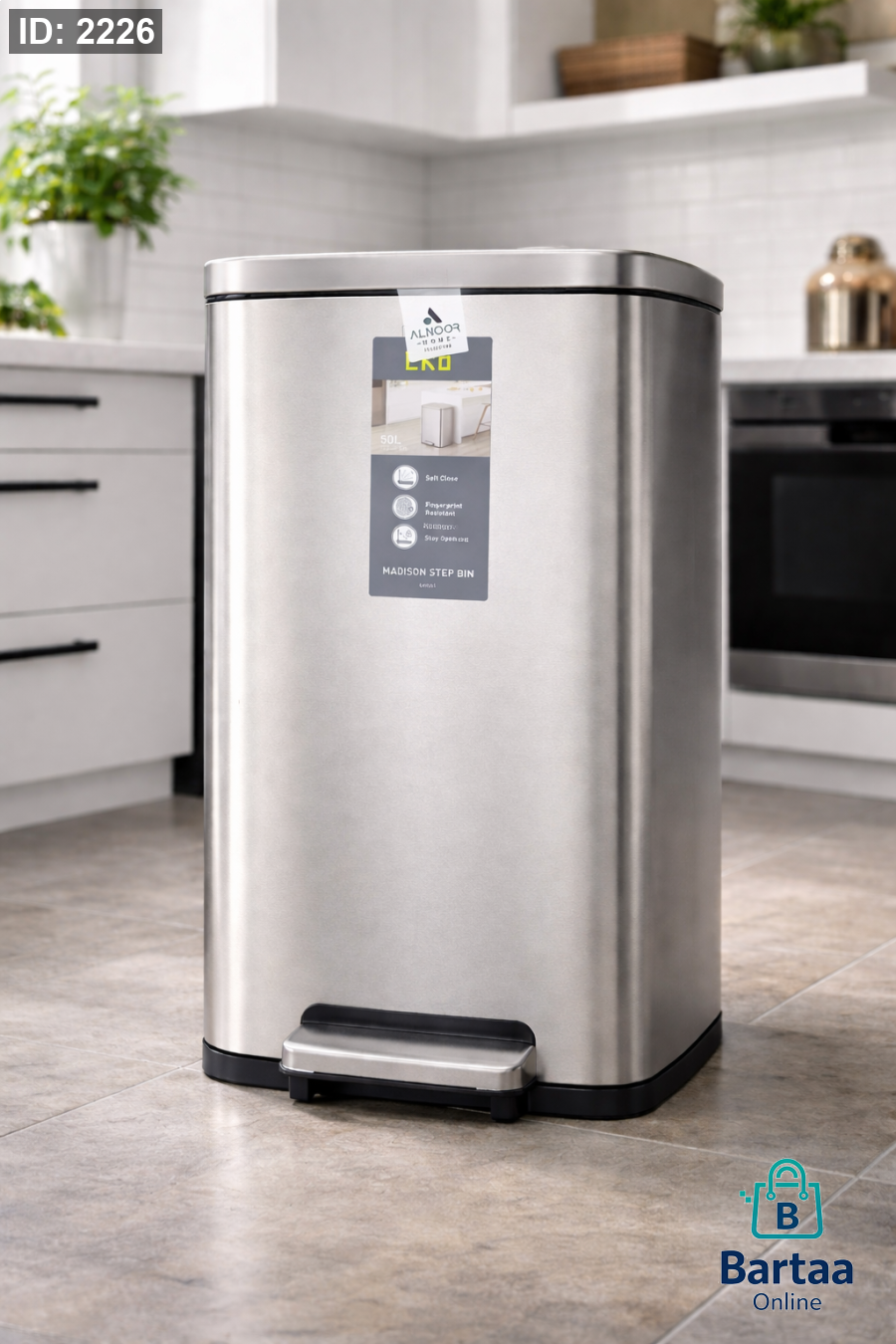 سلة مهملات ستانلس ستيل 50 لتر 🗑️ بتصميم عصري فاخر، دعسة قدم مع إغلاق هادئ (Soft Close)، مقاومة لبصمات الأصابع وتبقى مفتوحة عند الحاجة. مثالية للمطبخ والبيت الأنيق.