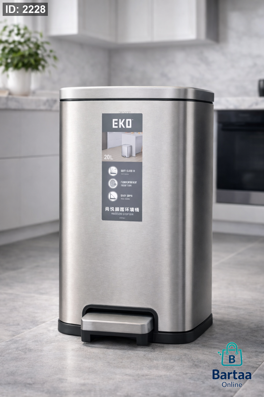 سلة مهملات ستانلس ستيل EKO بسعة 20 لتر 🗑️ بتصميم عصري وأنيق، دعسة قدم مع إغلاق هادئ (Soft Close)، مقاومة لبصمات الأصابع وتبقى مفتوحة عند الحاجة. مثالية للمطبخ والبيت العصري.