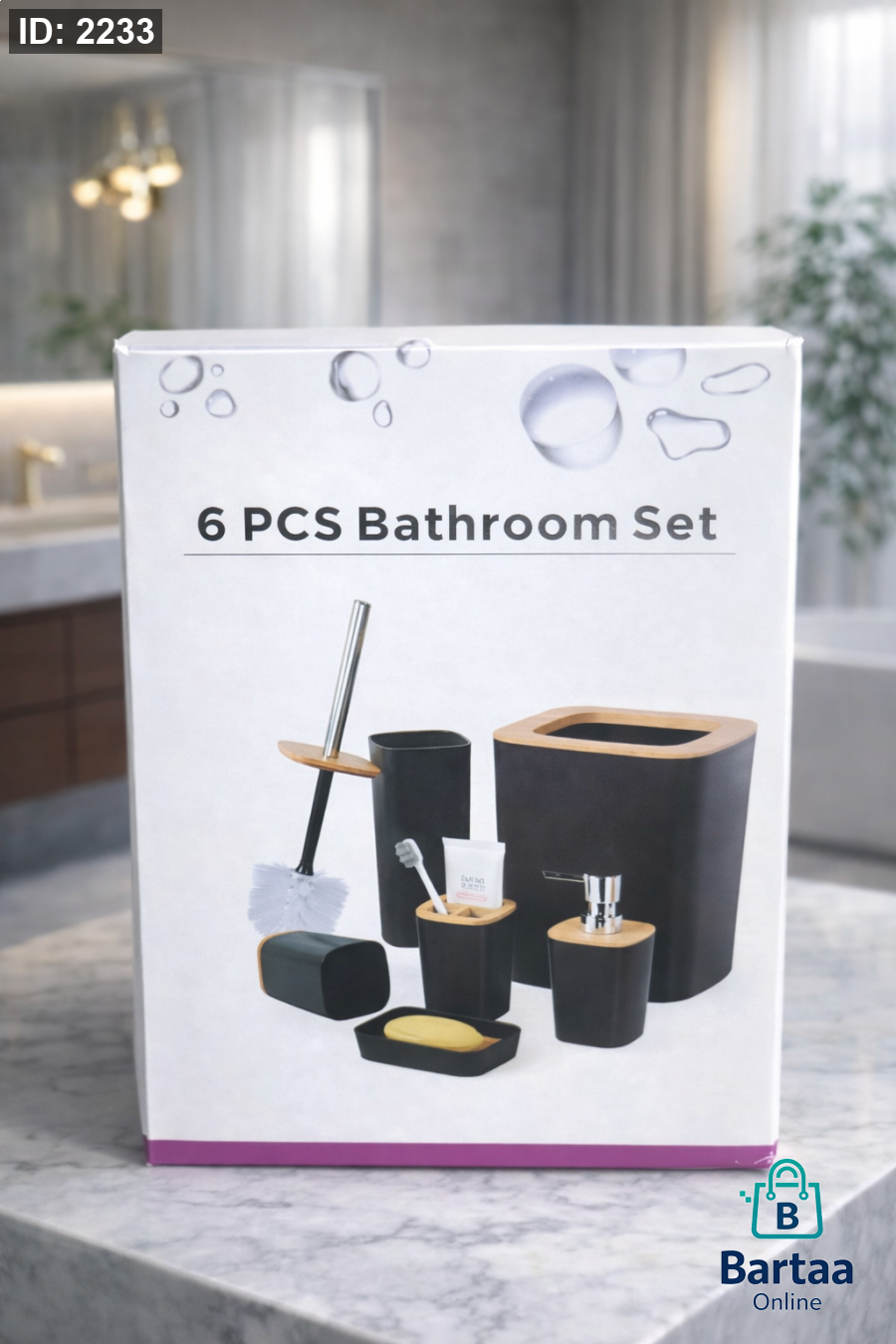 طقم حمّام 6 قطع بتصميم أنيق يجمع الأسود مع لمسة خشبية فخمة 🖤🪵