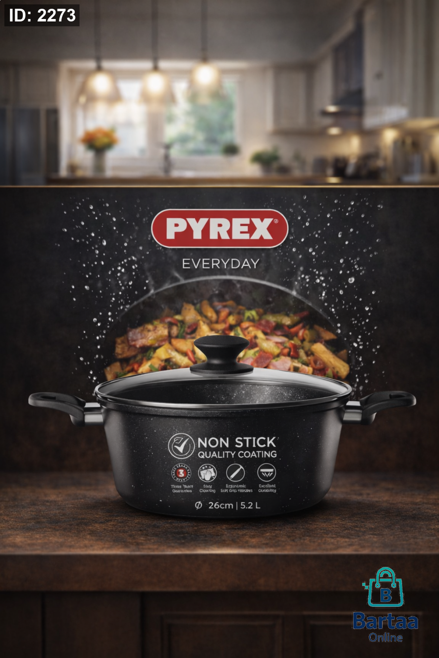 🍲 قدر PYREX Everyday غير لاصق حل مثالي للطبخ اليومي، طلاء غير لاصق عالي الجودة، توزيع حرارة متوازن، وغطاء زجاجي متين. عملي، سهل التنظيف، ويعطي نتائج ممتازة كل مرة 🔥 📏 المقاس: 26 سم | السعة: 5.2 لتر
