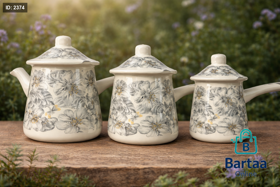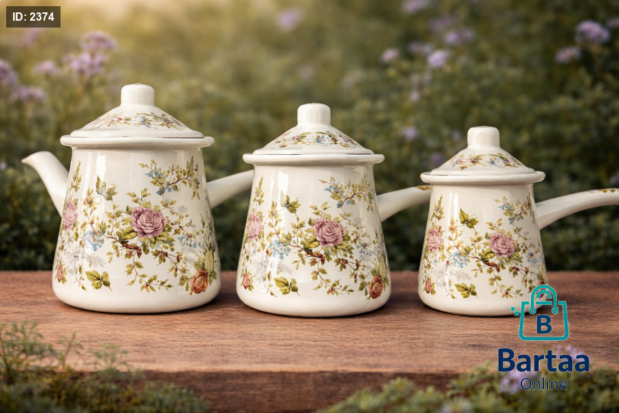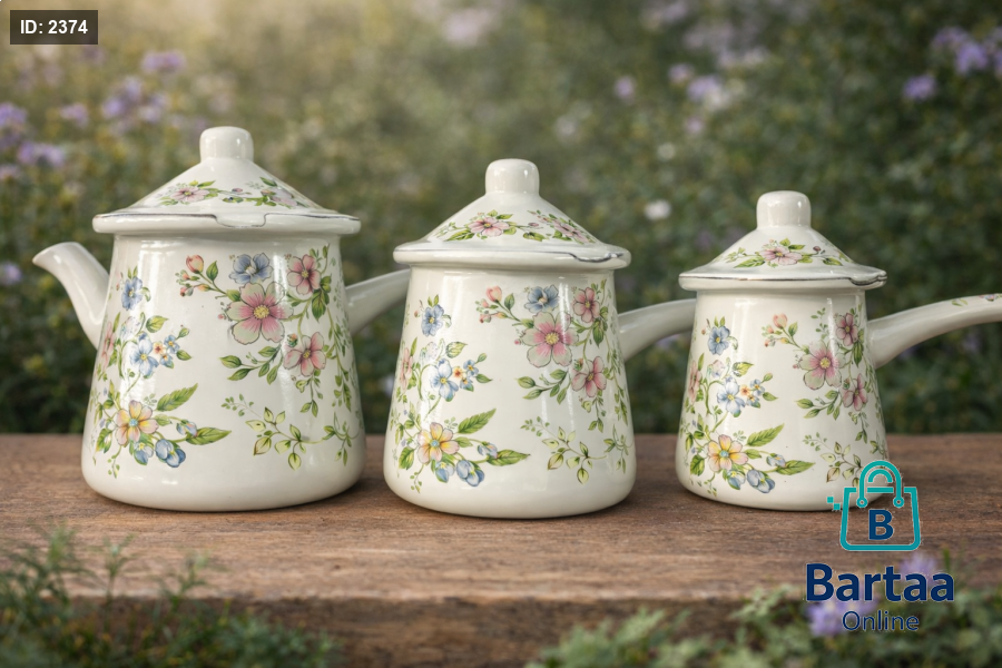 طقم ركوة قهوة مينا بتصميم كلاسيكي مزخرف، 3 أحجام مختلفة تناسب كل الاستخدامات. عملي، متين، ويعطي لمسة أناقة مميزة لتقديم القهوة العربية والتركية ☕🌸