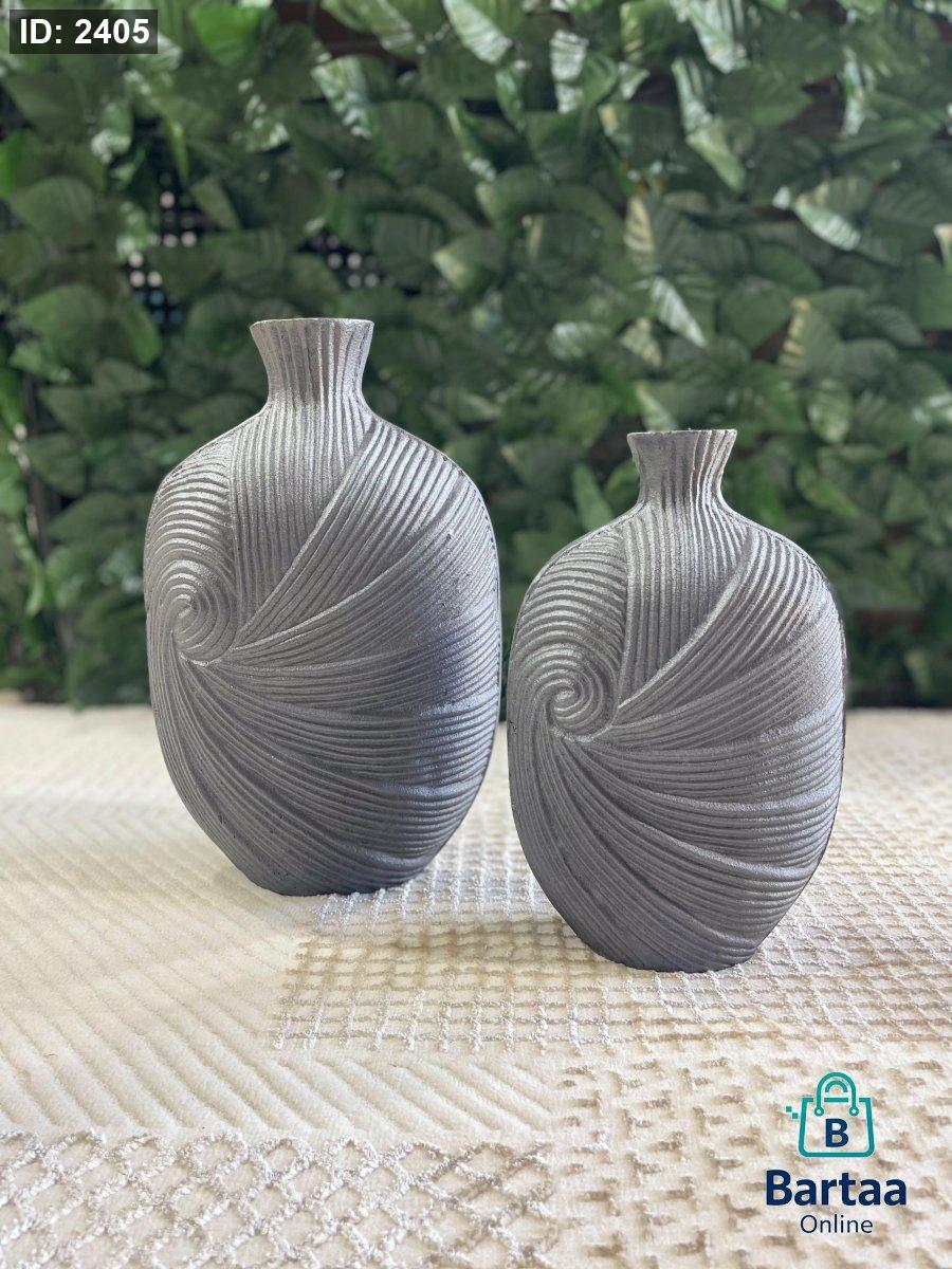 فازتان ديكور بتصميم حلزوني أنيق ولمسة فنية مميزة، بلون رمادي مطفي هادئ. تضيفان طابعاً عصرياً راقياً لأي مساحة، مثاليتان للطاولات والرفوف وزوايا الصالون، وتبدوان رائعتين مع الورد الجاف أو كقطعة ديكور مستقلة.