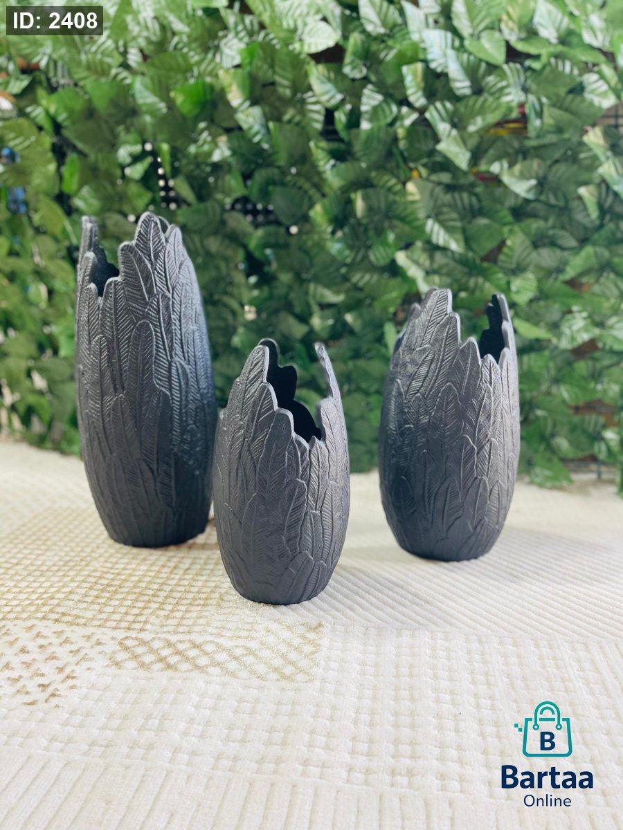 طقم فازات ديكور بتصميم أوراق أنيق ولمسة فنية عصرية، بلون رمادي داكن مطفي. يضيف عمقاً وأناقة لأي مساحة، مثالي للديكور المودرن ويبرز جمال الورد الجاف أو يُعرض كقطعة ديكور مستقلة تلفت الأنظار.