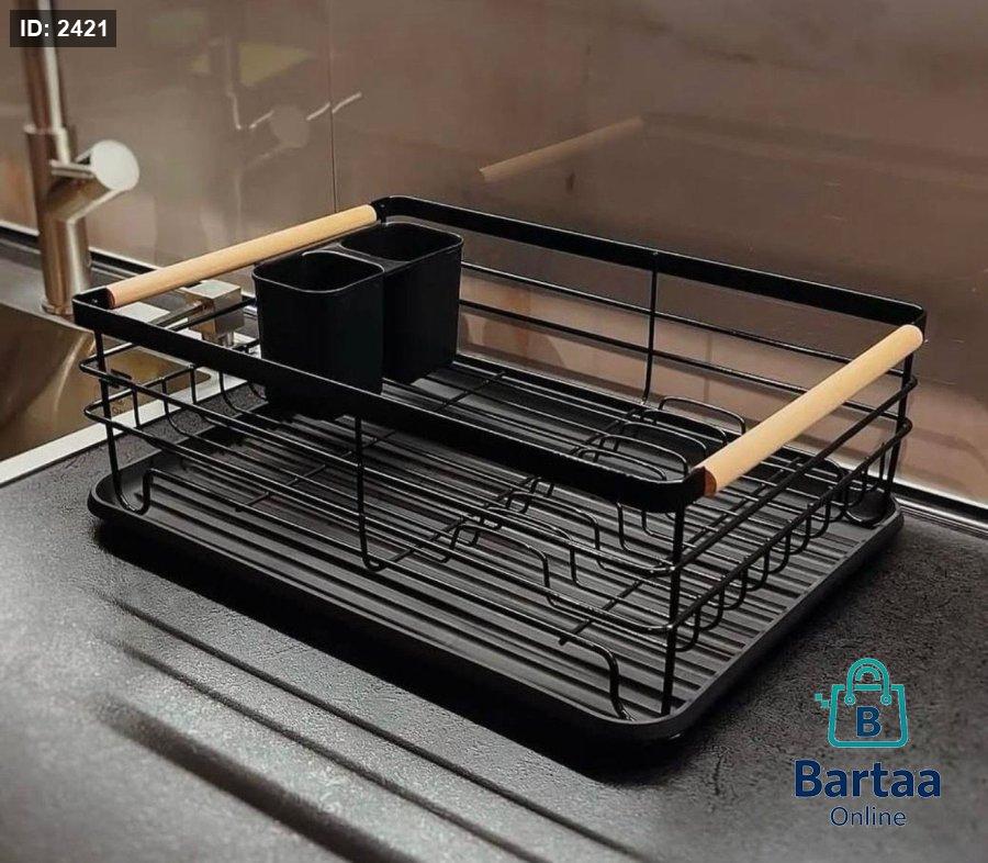 سلة جلي معدنية بتصميم عصري هيكل متين مع مقابض خشبية أنيقة، عملية لتجفيف الصحون والأكواب وتنظيم المطبخ بأسلوب راقٍ وبسيط 🖤🍽️