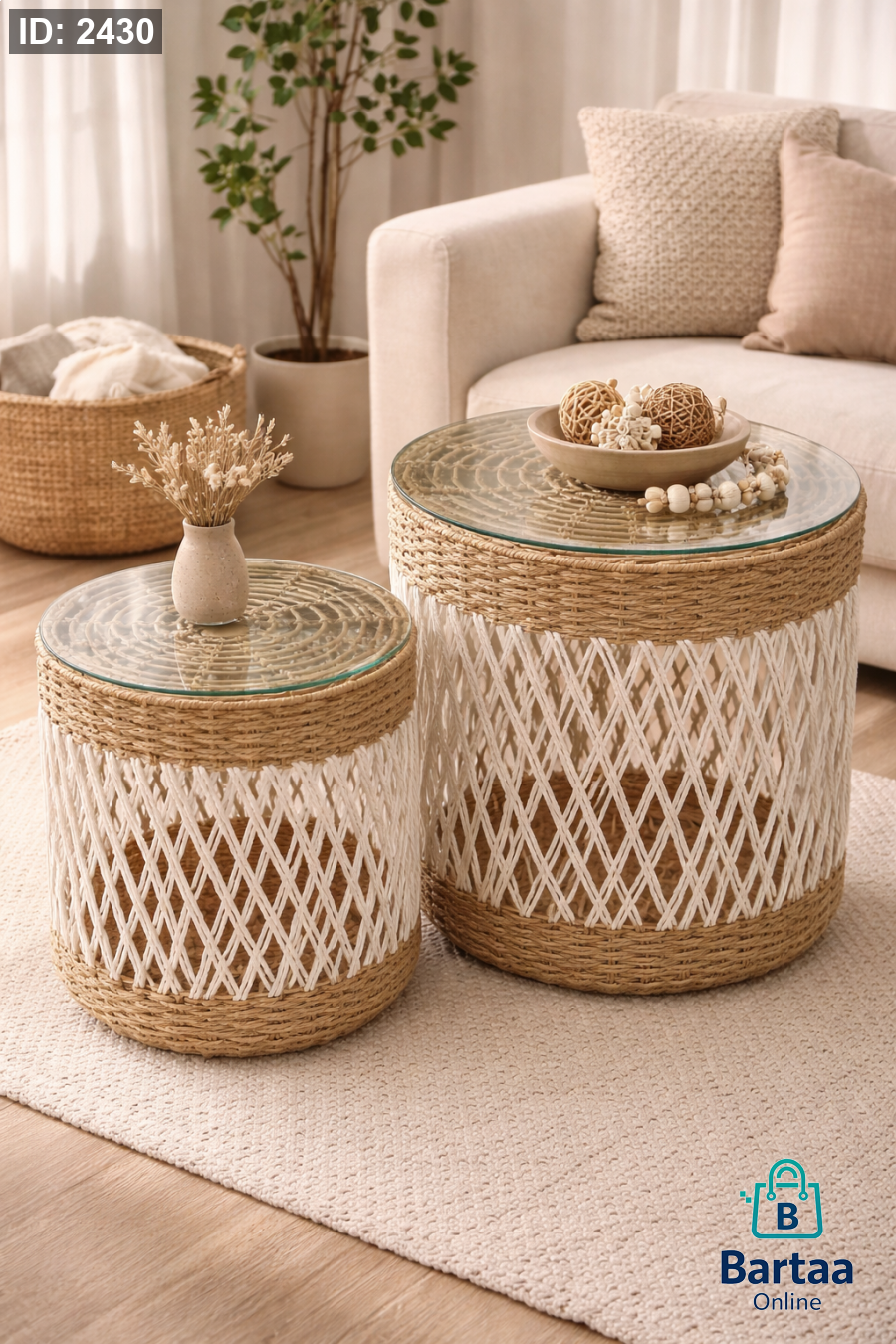 طقم طاولات جانبية رتان مع سطح زجاج تصميم طبيعي بلمسة بوهيمية أنيقة، عملي وخفيف ويضيف دفء وأناقة لغرفة الجلوس أو زاوية القهوة.