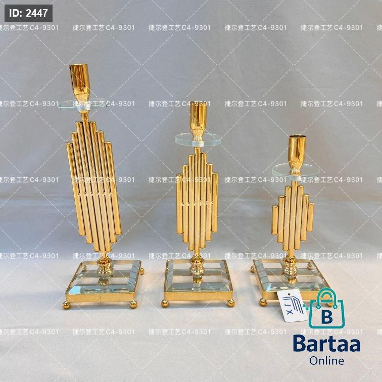 طقم شمعدانات فاخر بتصميم هندسي ذهبي ثلاثة مقاسات أنيقة بقاعدة زجاجية، تضيف لمسة فخامة عصرية للمجالس والطاولات وتناسب الديكورات الراقية.