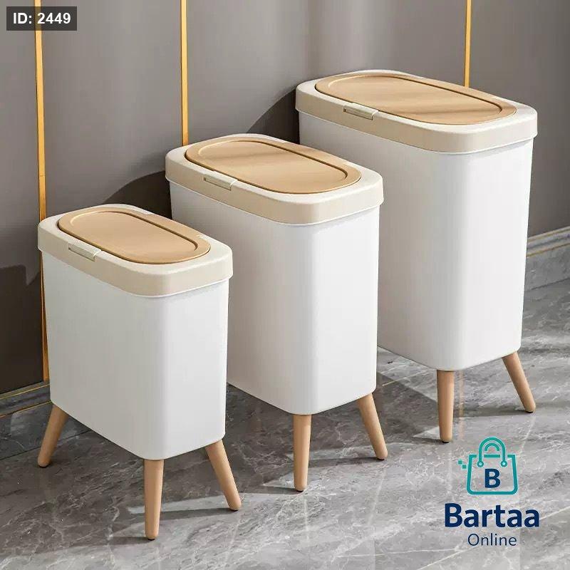 طقم سلال نفايات أنيقة بأرجل خشبية تصميم عصري بثلاث مقاسات، عملية وسهلة الاستخدام بغطاء أنيق، تضيف لمسة ترتيب وجمال للمطبخ أو الحمام.