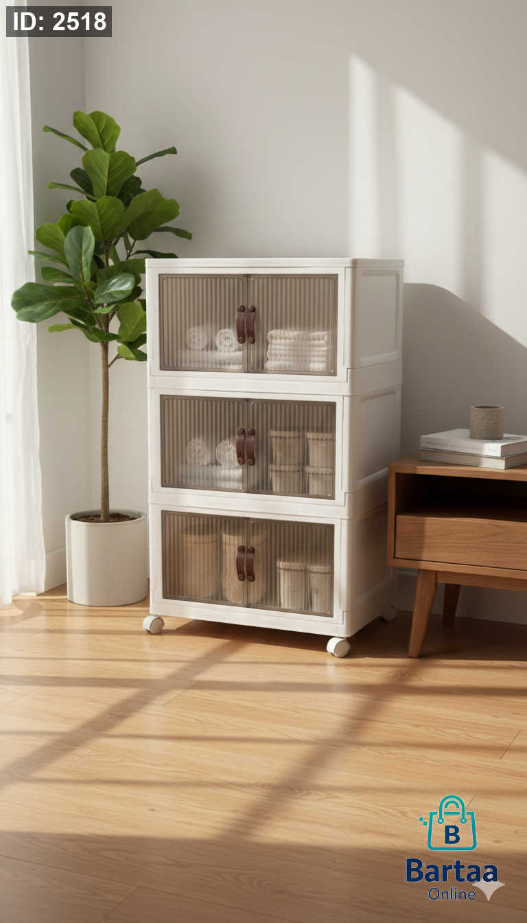 خزانة تخزين 3 طبقات بعجلات ✨ عملية وأنيقة، بأبواب شفافة لتنظيم سهل وواضح. مثالية للمطبخ أو غرفة الغسيل وتوفر مساحة بذكاء 👌
