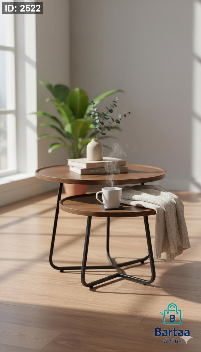 طقم طاولات قهوة جانبية (قطعتين) ☕✨ تصميم عصري بسطح خشبي وقاعدة معدنية أنيقة، عملي ويوفر مساحة لأي غرفة جلوس.
