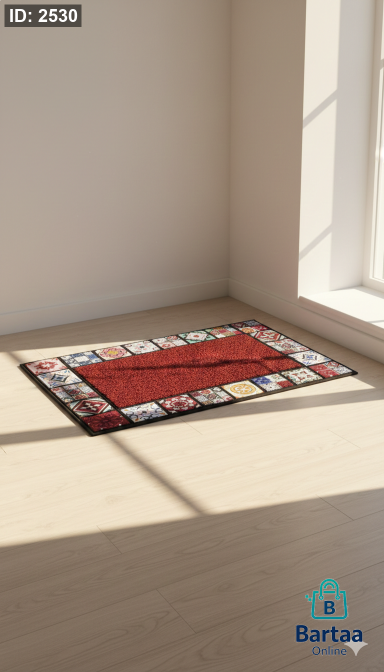 دعّاسة أرضية بتصميم مميز 🎨✨ وسط أحمر أنيق مع إطار نقوش ملوّنة يضيف لمسة دفء وجمال لمدخل بيتك. ثابتة وسهلة التنظيف ومثالية للاستخدام اليومي 👌